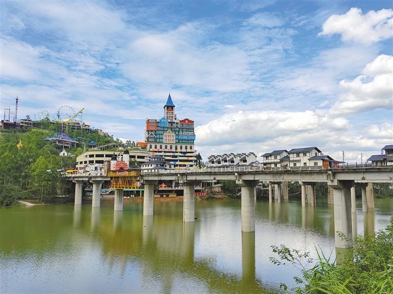 酒店以欧洲古典城堡为蓝本打造的五彩积木式造型,在阳光下愈发鲜亮——红色的热情、黄色的活力与蓝白绿的清新交织碰撞。高耸的塔楼、宏伟的拱门倒映在平静江面,偶有船舶驶过激起粼粼波光,让“碧水映城堡”的画卷多了几分动感。